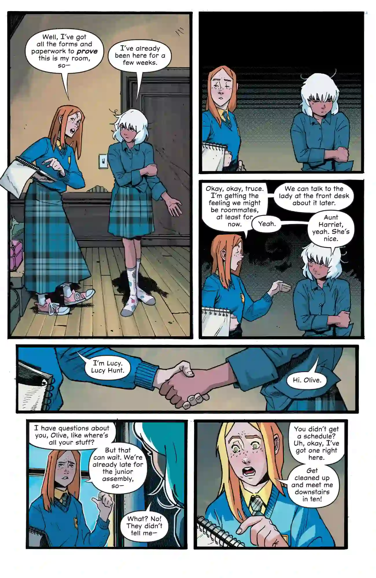 September in Gotham Academy, Olive Silverlock, new scholarship student, hides under her bed as a new student enters. The student, Lucy Hunt, is surprised and a bit snooty about having to share a room with Olive (who is struggling with flashbacks to her violent summer), but is pleasant enough and willing to help Olive for her first day of class. Olive feels completely alone during orientation.